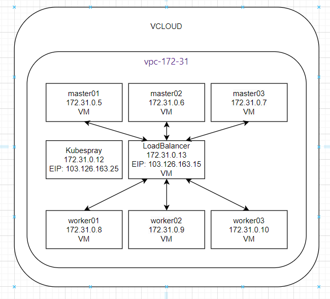 Bài viết sẽ hướng dẫn các bạn cài đặt một hệ thống Kubernetes Cluster bằng Kubespray với đầy đủ các thành phần giống như một hệ thống Product. Chúng ta sẽ xây dựng hệ thống Kubernetes Cluster gồm 03 node Master, 03 node Worker và các hệ thống phụ trợ như LoadBalancer Api-Server, LoadBalancer ingress