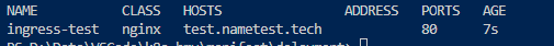 Tạo và triển khai Ingress với manifest file nginx-test-ingress.yaml , chuyển hướng truy vấn vào ứng dụng trên khi truy cập bằng tên miền test.nametest.tech với giao thức http. Khi truy cập ingress sẽ chuyển hướng đến service của ứng dụng web dã tạo trước đó.