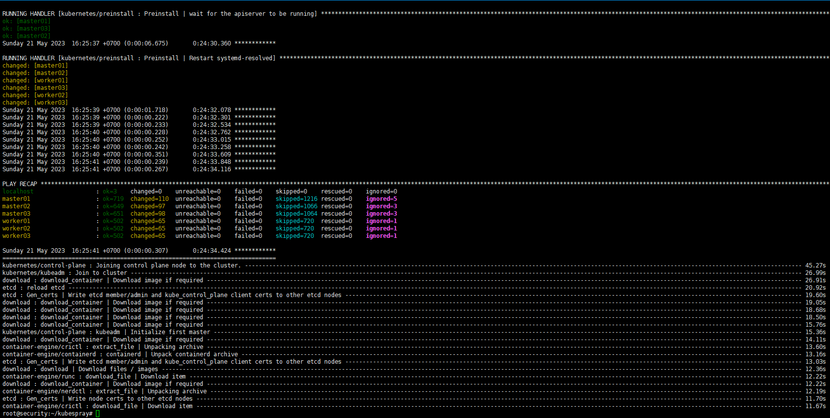 Trong bước này ansible kết nối đến các node bằng SSH và cài đặt Kubernetes, cài đặt nhanh hay chậm sẽ phụ thuộc vào tốc độ internetKết quả hoàn thành cài đặt sẽ như sau:
