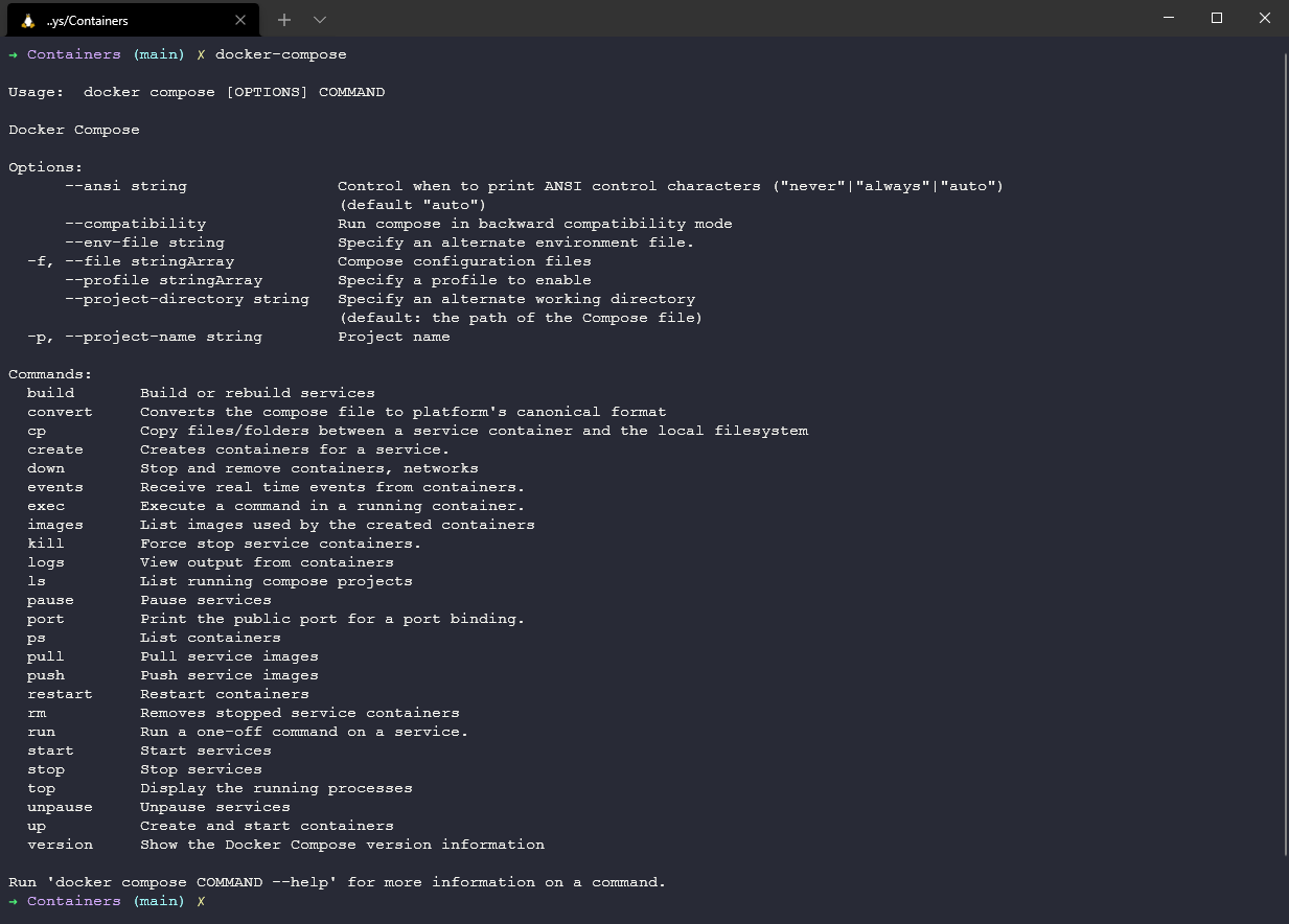 Để xác nhận rằng chúng ta đã cài đặt docker-compose trên hệ thống của mình, chúng ta có thể mở một terminal và gõ lệnh trên.