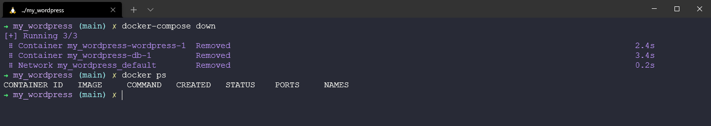 Để xóa mọi thứ, chúng ta có thể sử dụng lệnh docker-compose down.