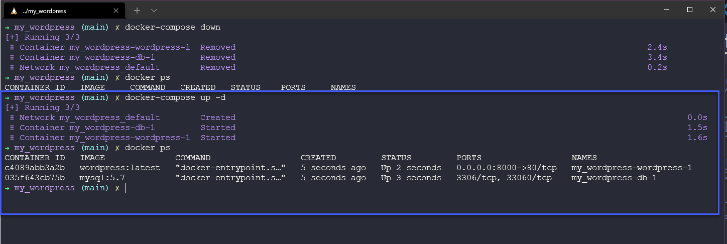 Bây giờ, khi chúng ta sử dụng lại docker-compose up -d, các ứng dụng sẽ khởi động lại, tuy nhiên, các image đã có sẵn hệ thống của chúng ta nên sẽ không cần phải pull lại chúng từ kho lưu trữ DockerHub.