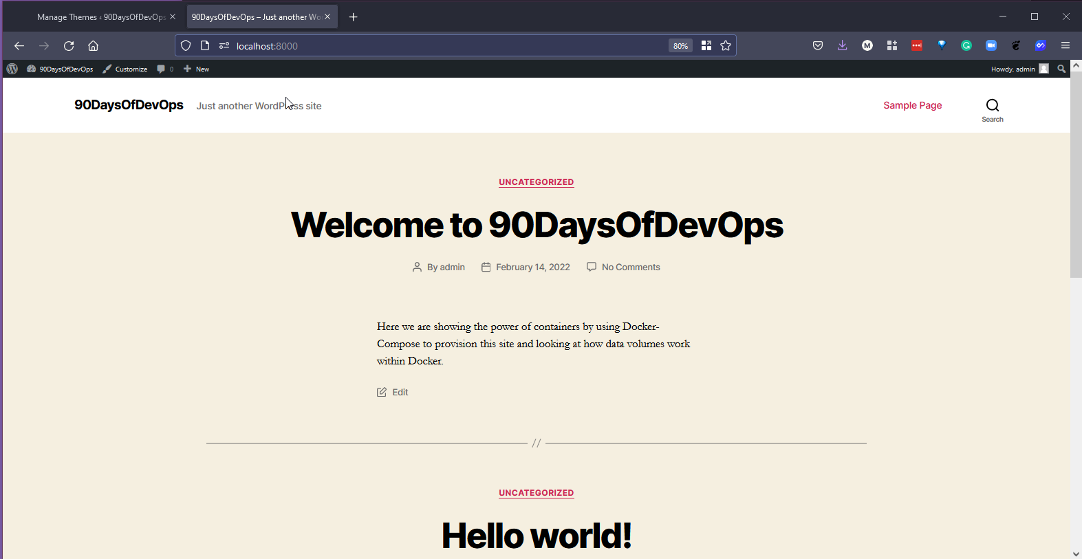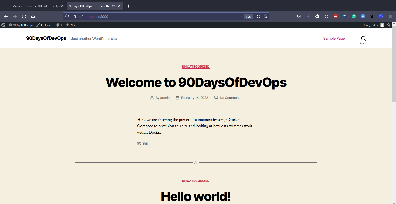 Sau đó, chúng ta truy cập tới cùng một địa chỉ http://localhost:8000 và nhận thấy rằng bài đăng mới và thay đổi về theme vẫn còn nguyên.
