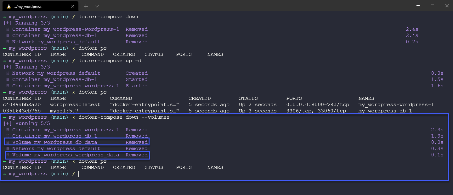 Nếu chúng ta muốn loại bỏ các containers và các volumes đó thì việc sử dụng lệnh docker-compose down --volumes cũng sẽ xoá bỏ các volumes.