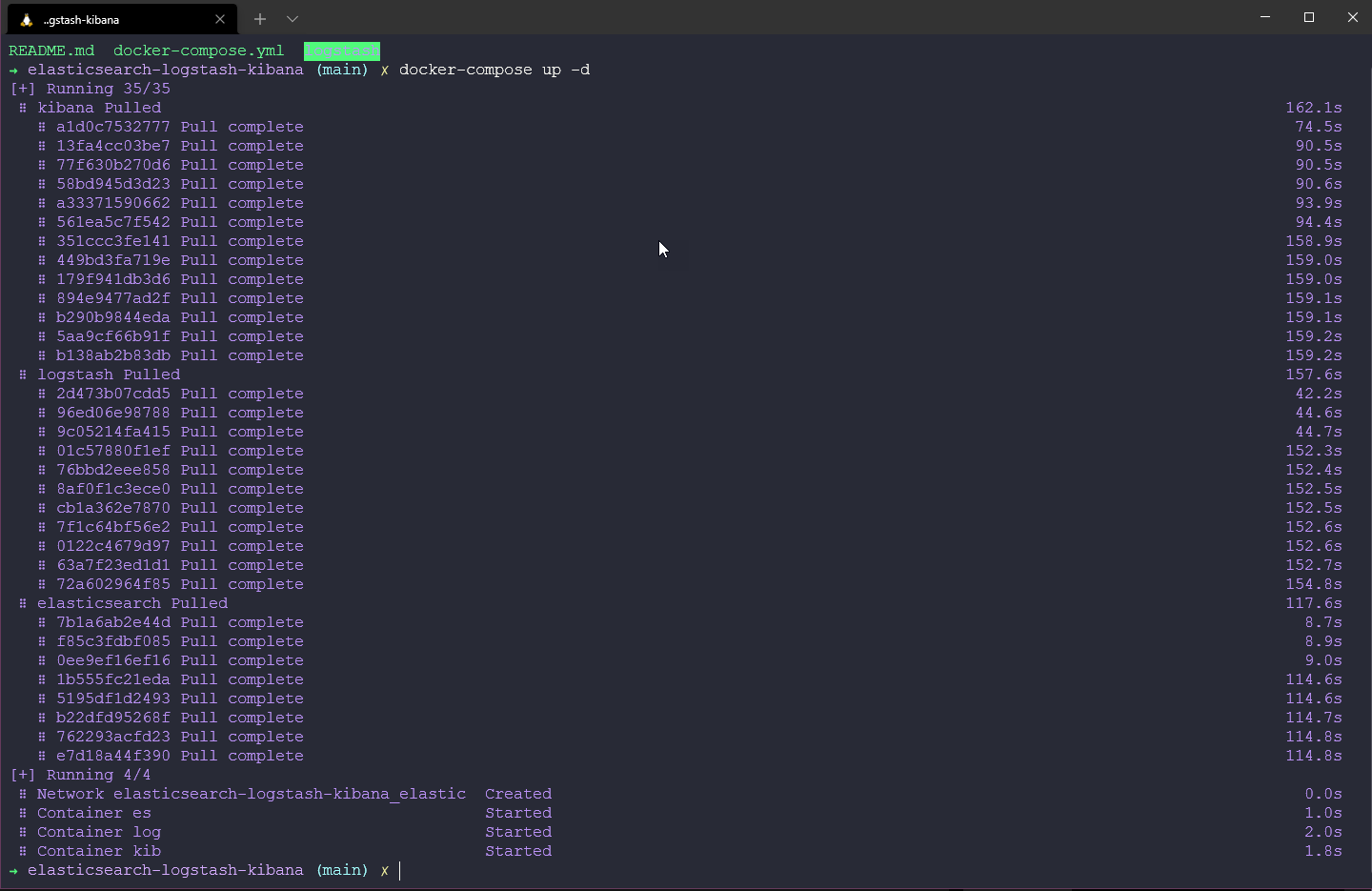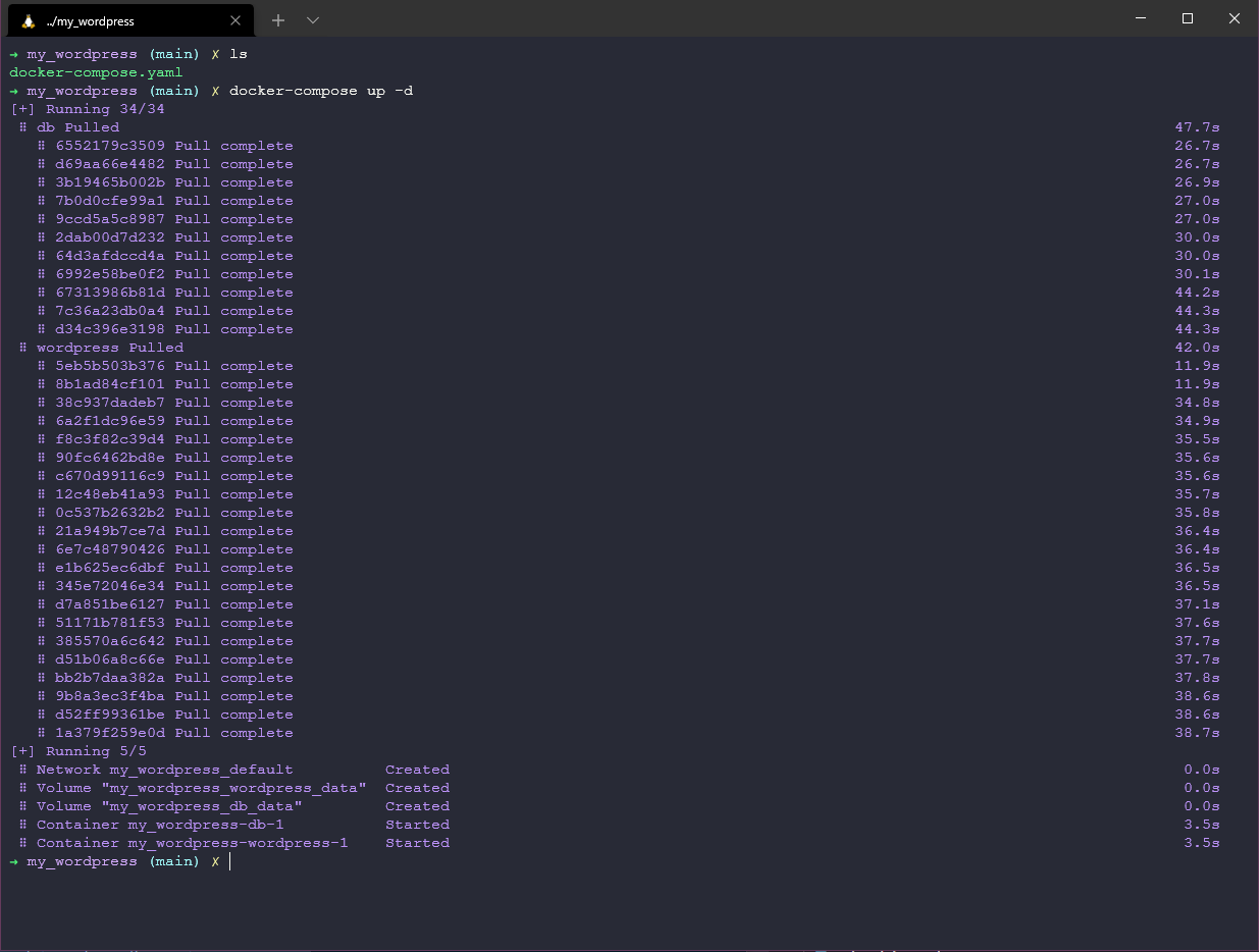 Từ terminal, chúng ta chỉ cần chạy docker-compose up -d, thao tác này sẽ bắt đầu quá trình pull những image và dựng ứng dụng có nhiều containers của bạn.
