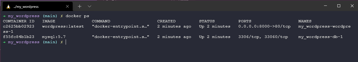 Nếu bây giờ chúng ta chạy lệnh docker ps, bạn có thể thấy chúng ta có 2 containers đang chạy, một là WordPress và một là MySQL.