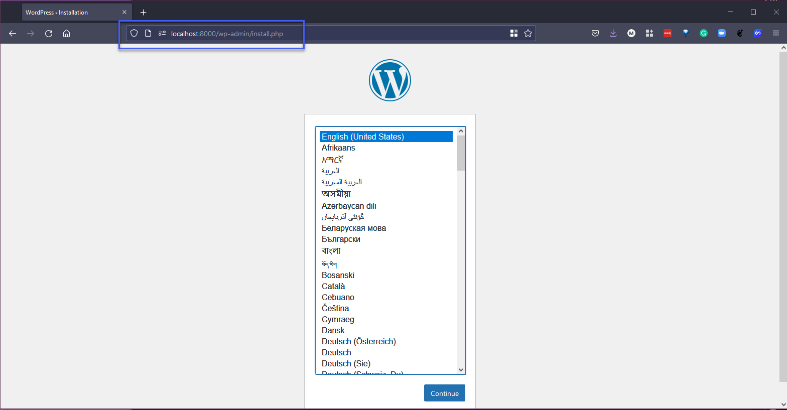 Tiếp theo, chúng ta có thể xác thực việc đã thiết lập và chạy WordPress bằng cách mở trình duyệt và truy cập http://localhost:8000, bạn sẽ thấy trang thiết lập WordPress.