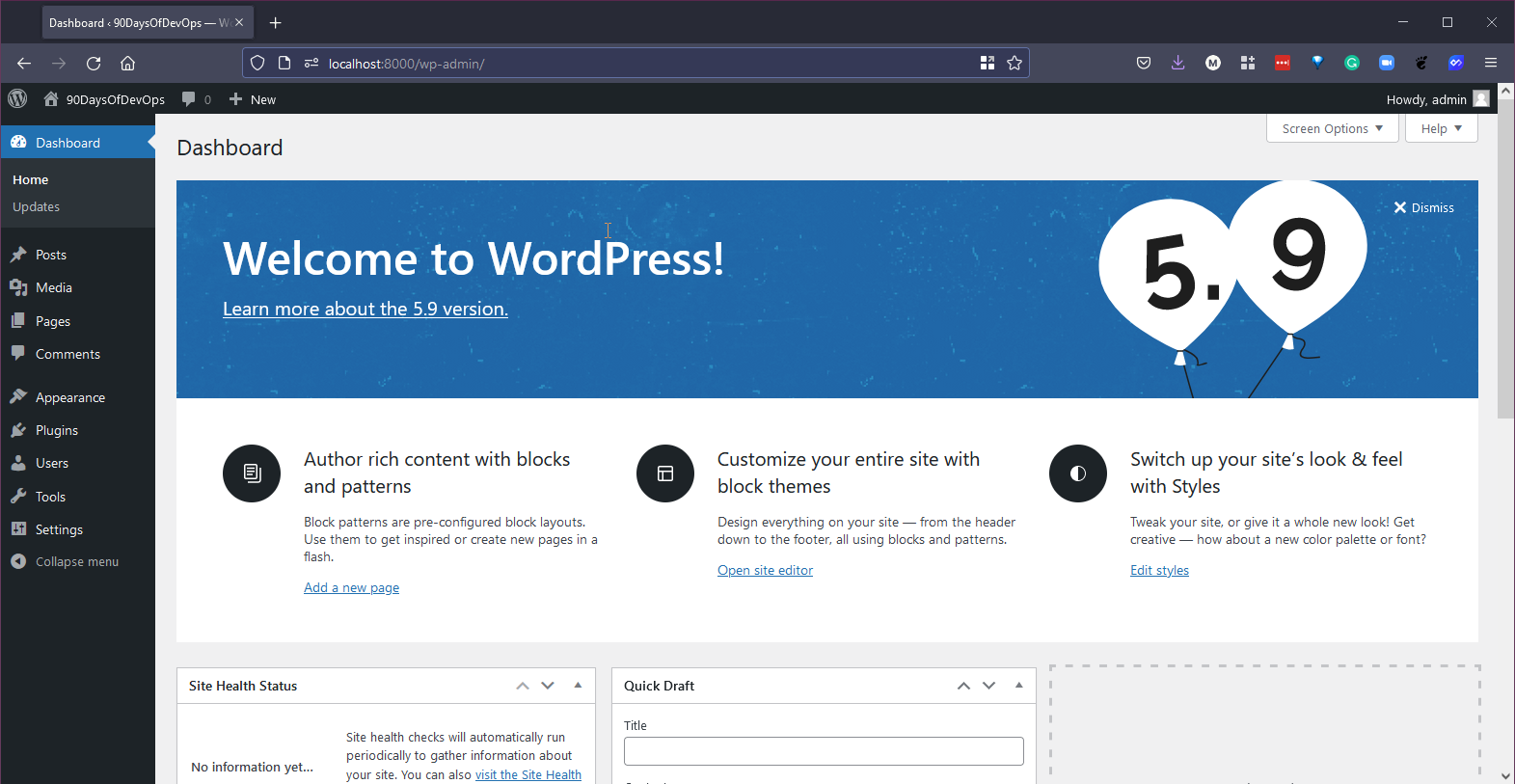 Chúng tôi có thể trải qua quá trình thiết lập WordPress và sau đó có thể bắt đầu xây dựng trang web của mình với bảng điều khiển bên dưới.