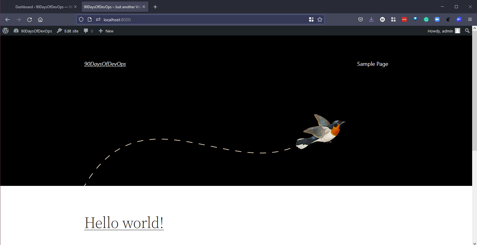 Sau đó, nếu chúng ta mở một tab mới và điều hướng đến cùng một địa chỉ mà chúng ta đã làm trước đó http://localhost:8000 thì sẽ thấy một theme mặc định đơn giản với tiêu đề trang web là "90DaysOfDevOps" và một bài đăng mẫu.