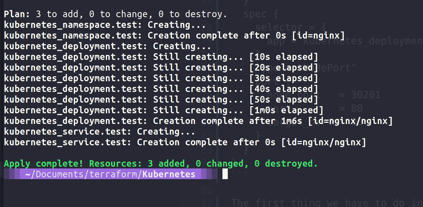 Khi chúng ta chạy lệnh terraform apply, điều này sẽ tạo ra 3 tài nguyên mới đó là namespace, deployment và service trong cụm Kubernetes của chúng ta.