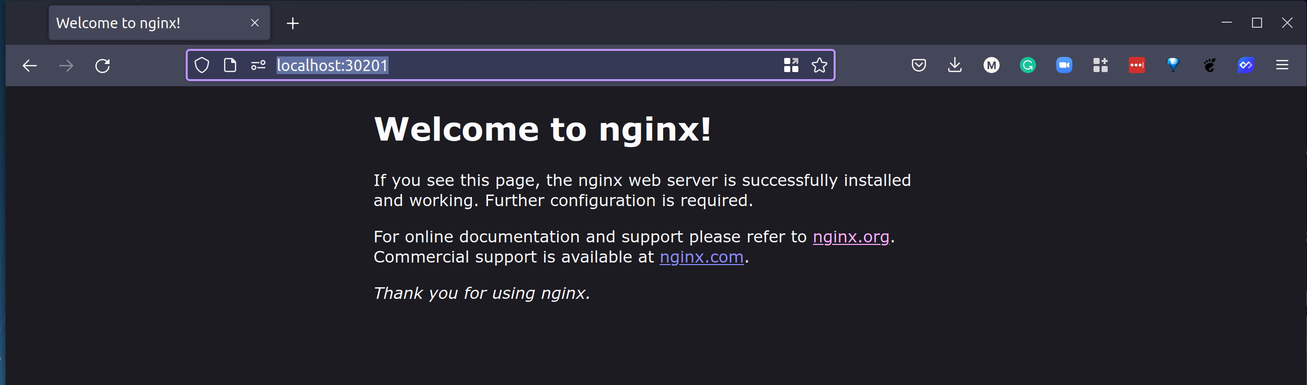 Bây giờ, vì chúng ta đang sử dụng minikube như bạn đã thấy trong phần trước, điều này có một số hạn chế khi chúng ta thử nghiệm với mạng docker cho ingress. Nhưng nếu chúng ta chỉ đơn giản sử dụng lệnh kubectl port-forward -n nginx svc/nginx 30201:80 và mở trình duyệt đến http://localhost:30201/, chúng ta sẽ thấy trang NGINX của chúng ta.