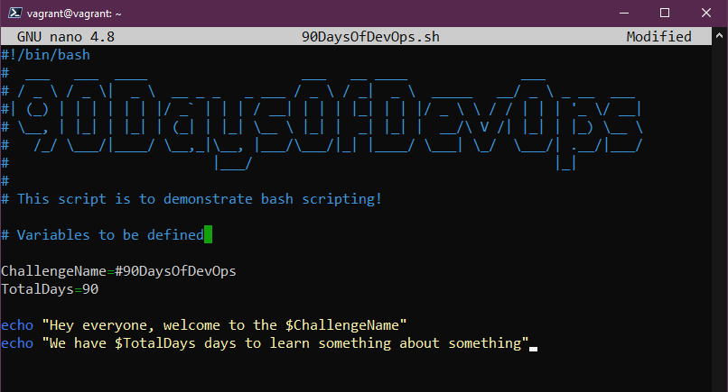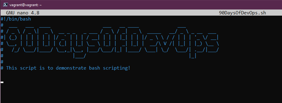 Tiếp theo là nano 90DaysOfDevOps.sh, thao tác này sẽ mở tập lệnh shell trống mới trong nano. Một lần nữa, bạn có thể chọn trình soạn thảo văn bản mà mình muốn ở đây.