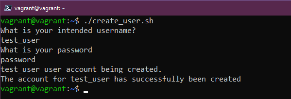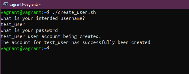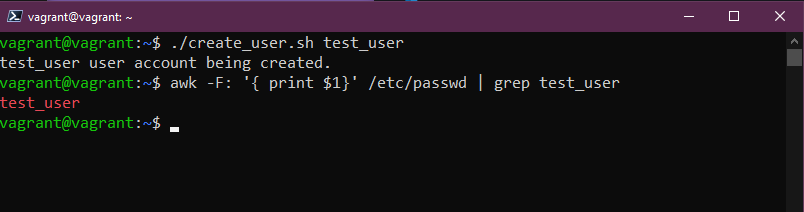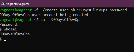 Yêu cầu cuối cùng là "Thông báo tạo tài khoản thành công được hiển thị." Chúng ta đã có dòng này ở dòng trên cùng của mã và có thể thấy ảnh chụp màn hình ở trên có dòng 90DaysOfDevOps user account being created được hiển thị.