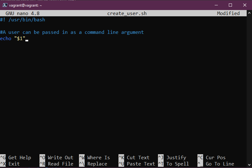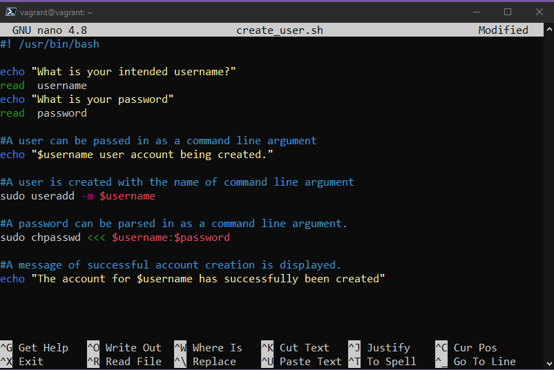Sau đó chúng ta có thể sử dụng nano create_user.sh để bắt đầu chỉnh sửa tập lệnh của mình cho kịch bản mà chúng ta đã đặt.