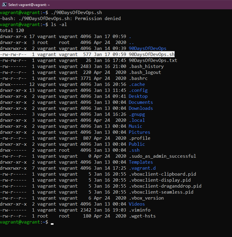 Sau đó, bạn có thể lưu tệp này và thoát trình soạn thảo văn bản của mình, nếu chúng ta chạy tập lệnh của mình với ./90DaysOfDevOps.sh, bạn sẽ nhận được thông báo lỗi do không có đủ quyền. Bạn có thể kiểm tra quyền của tệp này bằng cách sử dụng lệnh ls -al và có thể thấy chúng ta không có quyền thực thi đối với tệp này.