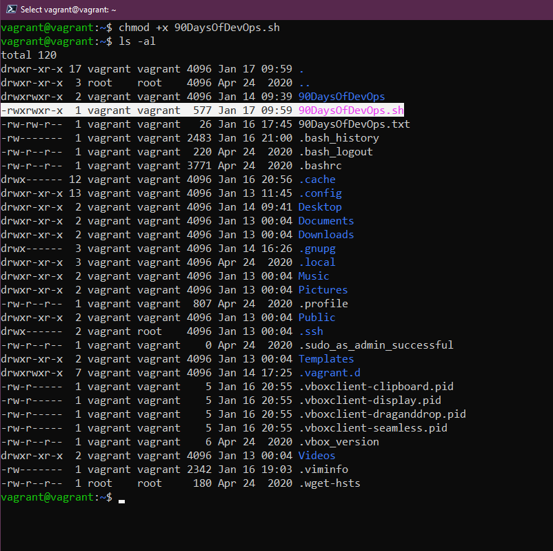 Có thể thay đổi điều này bằng cách sử dụng chmod +x 90DaysOfDevOps.sh và sau đó bạn sẽ thấy x, có nghĩa là bây giờ chúng ta có thể thực thi tập lệnh của mình.