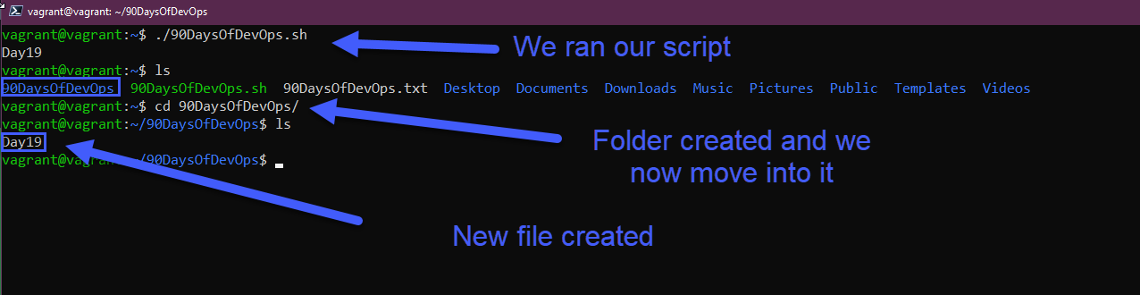 Bây giờ chúng ta có thể chạy lại tập lệnh của mình bằng cách sử dụng ./90DaysOfDevOps.sh. Sau khi chạy, tập lệnh hiện đã tạo một thư mục mới, thay thư mục hiện tại thành thư mục đó đó và cuối cùng tạo một tệp mới.