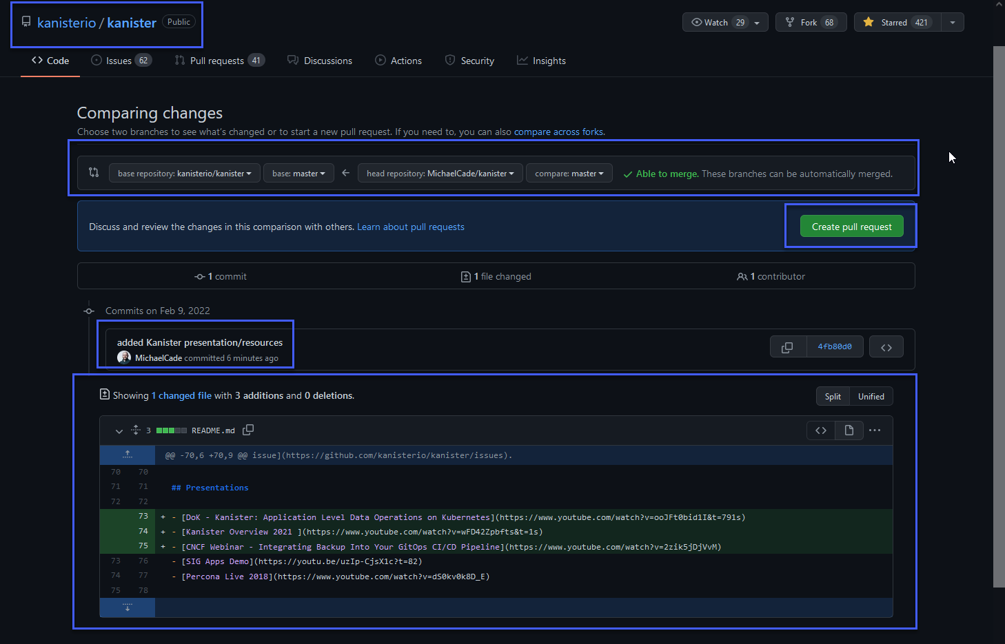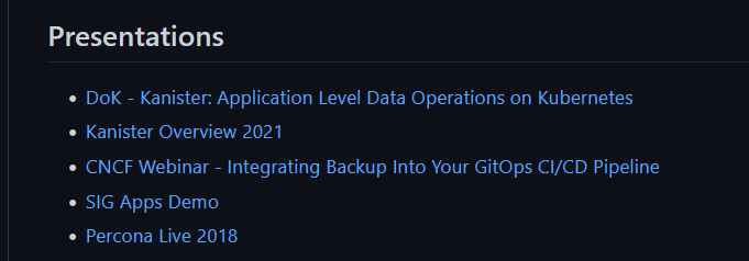 Điều đầu tiên chúng ta phải làm là tìm một dự án mà chúng ta có thể đóng góp. Gần đây, tôi đã thuyết trình về dự án Kanister Project và tôi muốn chia sẻ các bài thuyết trình của mình đã được đăng tải trên Youtube tới tệp Readme.md trong project đó.