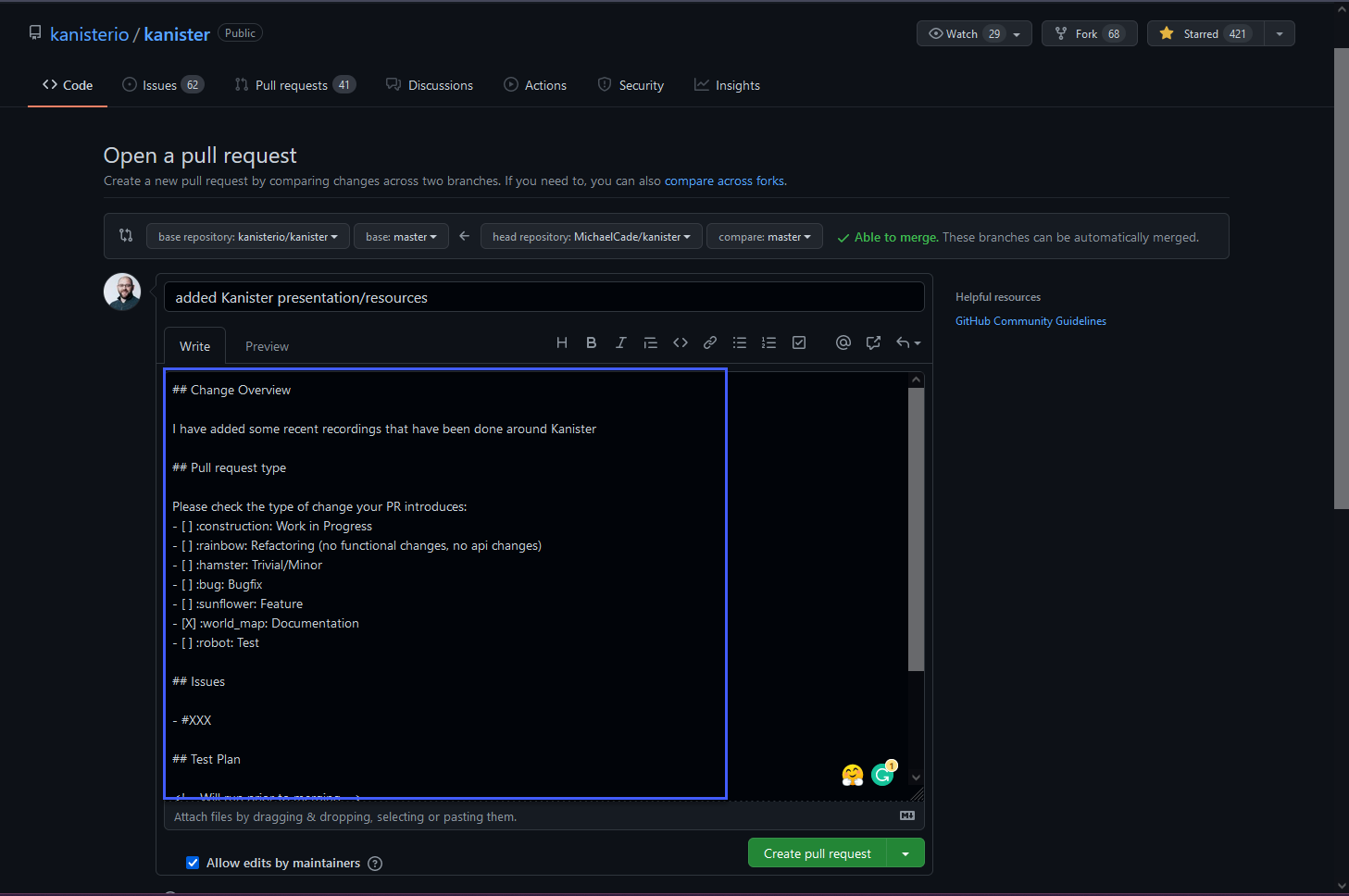 Sau đó, tuỳ thuộc vào cách người bảo trì dự án thiết lập chứng năng Pull Request trong kho lưu trữ của họ, bạn có thể cần hoặc không cung cấp những thông tin về Pull request theo một template mà người bảo trì đã chuẩn bị.